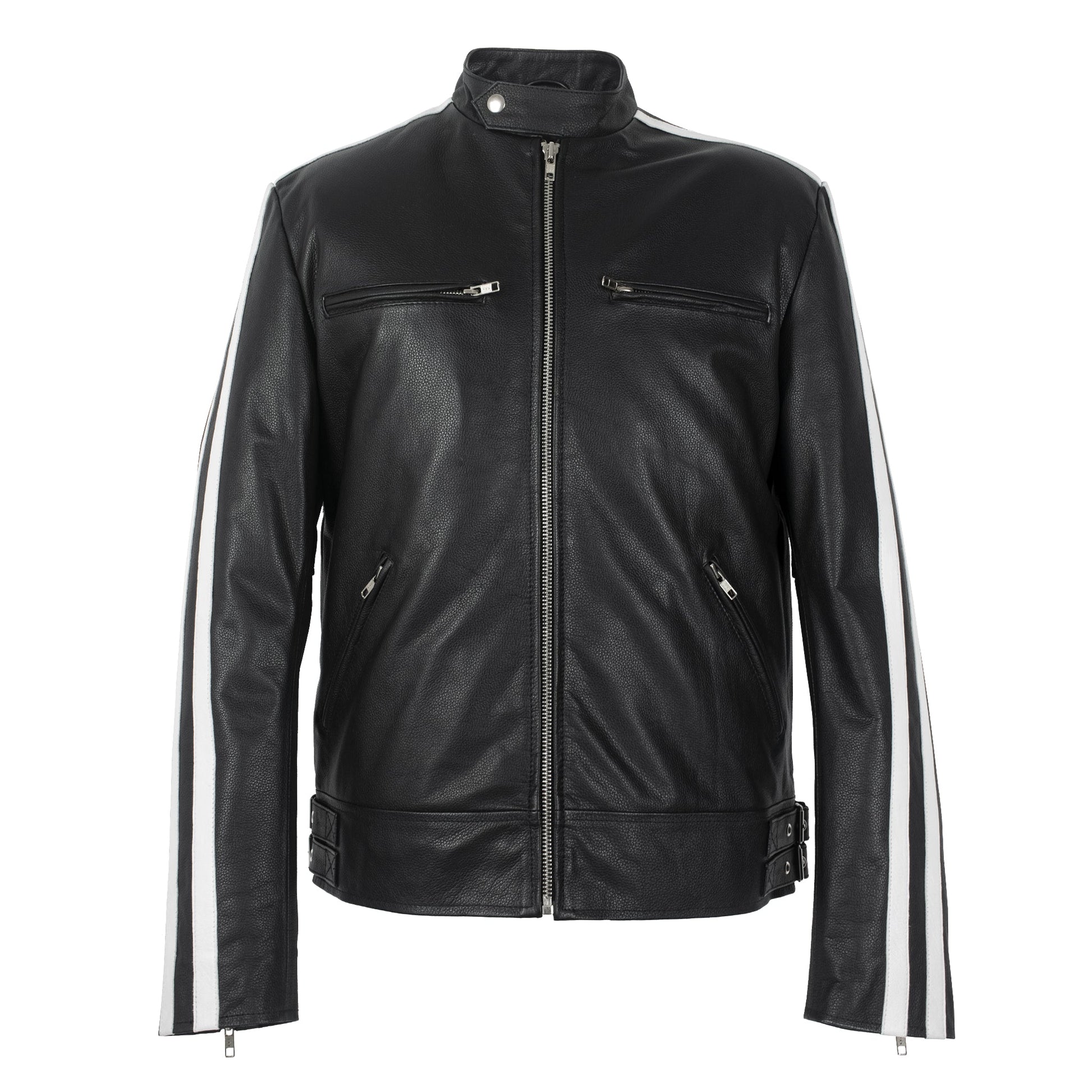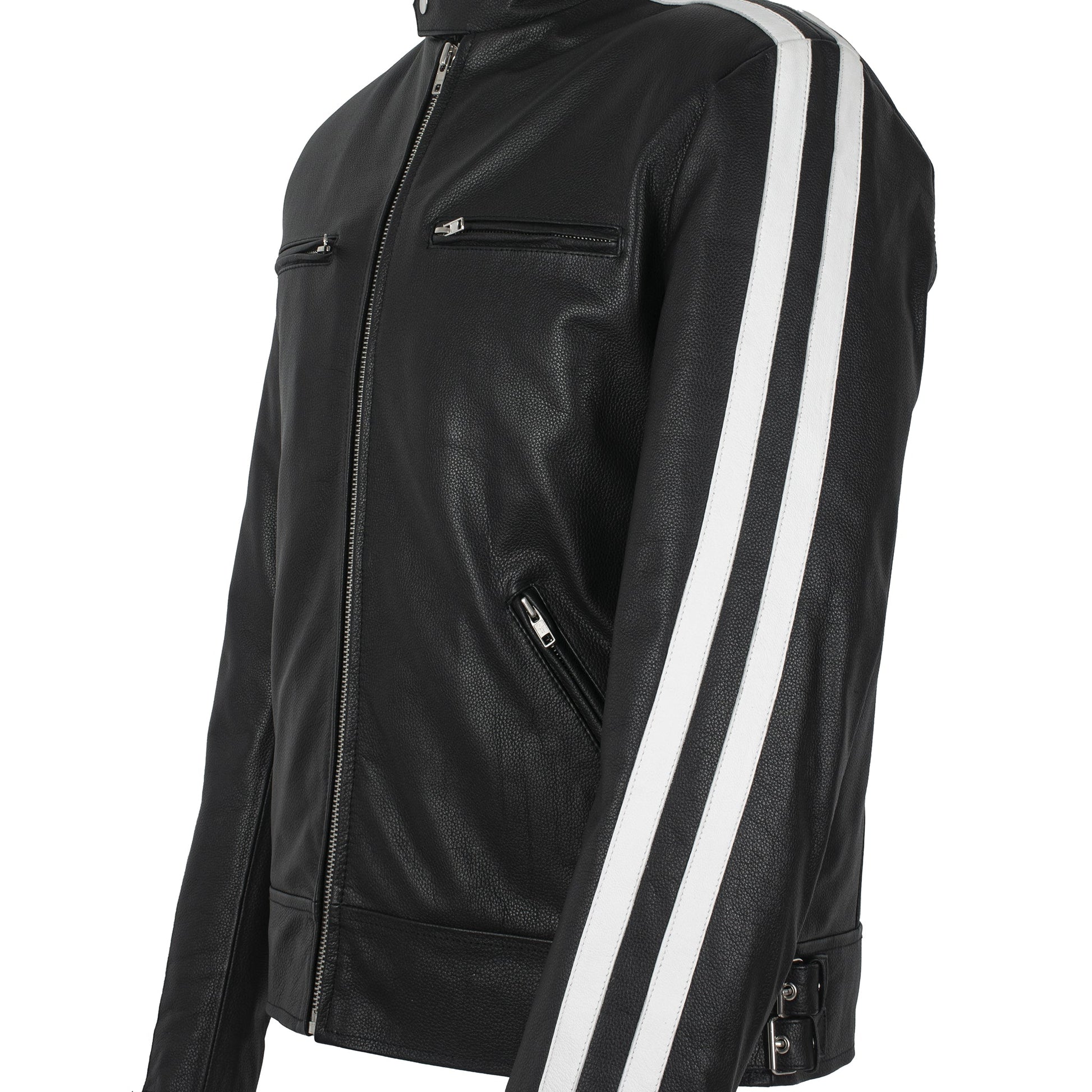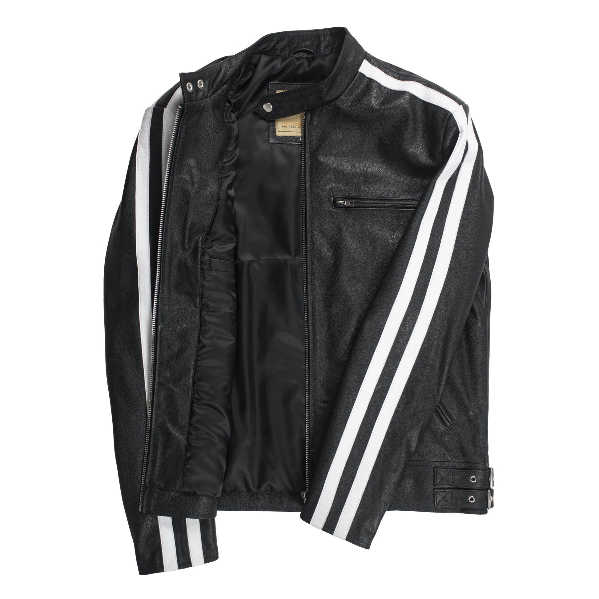 What makes Streetline Racer Leather Jacket stand out? The clean black base with sharp white racing stripes down the arms gives it an edge. The snap-tab collar gives a nice structured finish and keeps the neckline in place, while the smooth YKK zipper on the front adds both function and polish.